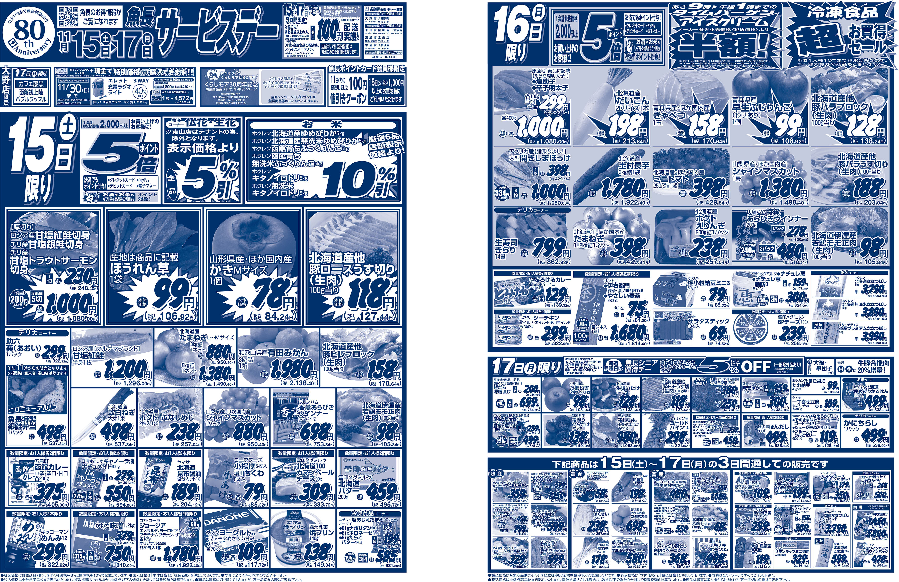 ホーム > WEBでチラシ ※売出企画商品のインターネットでの販売・ご注文は承っておりません。ご了承下さい 売出企画名売出期間開催店舗 魚長 サービスデー2025年11月15日(土)〜17日(月)夢市場全店舗のみ(げんき市場店舗、乃木市場を除く) 企画名をクリックでチラシを閲覧できます。