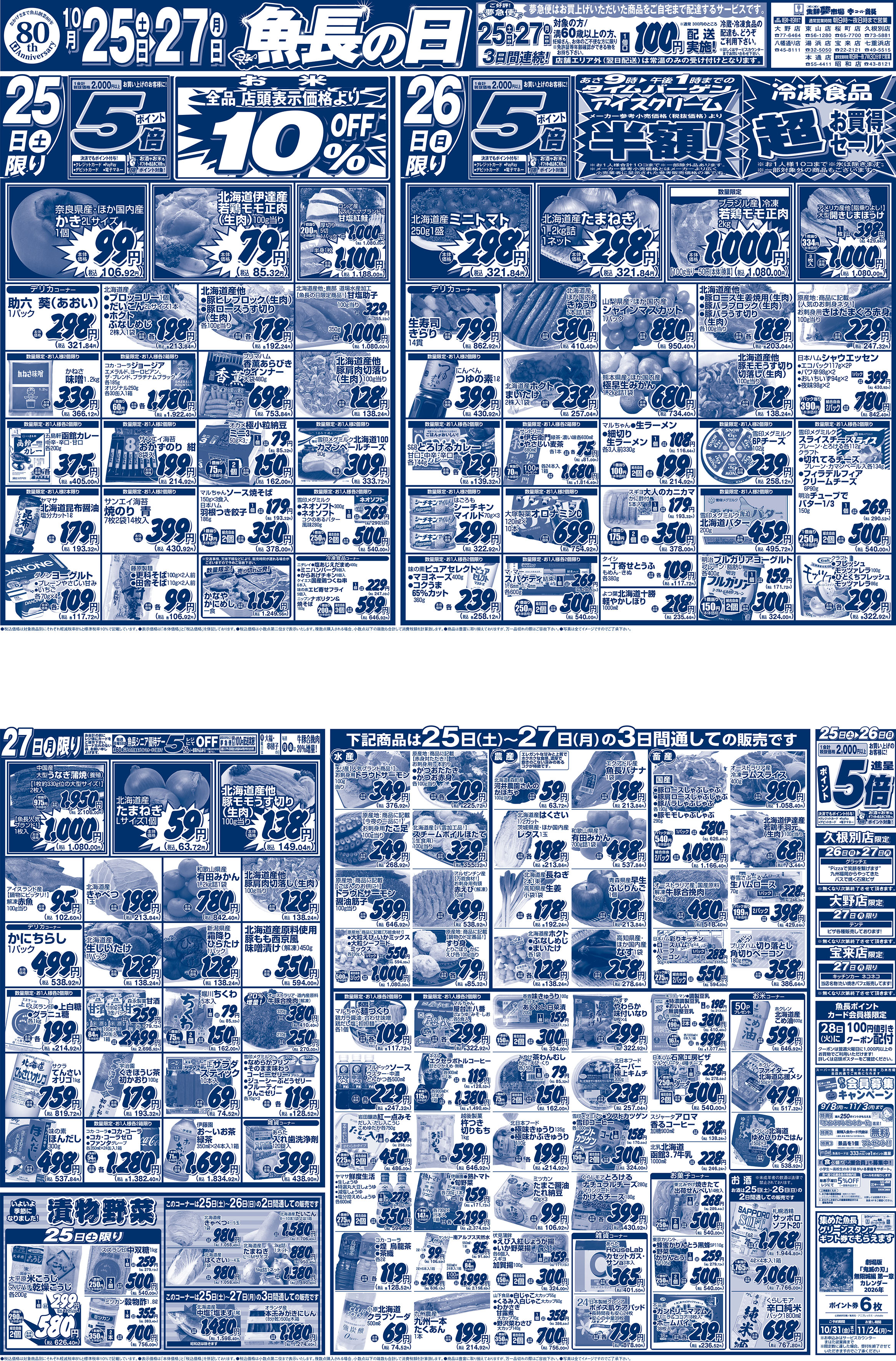 ホーム > WEBでチラシ ※売出企画商品のインターネットでの販売・ご注文は承っておりません。ご了承下さい 売出企画名売出期間開催店舗 魚長の日2025年10月25日(土)〜27日(月)夢市場全店舗のみ(げんき市場店舗、乃木市場を除く) 企画名をクリックでチラシを閲覧できます。