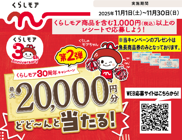 ホーム > 新着情報一覧 > ✨🎯くらしモア30周年キャンペーン第2弾!✨くらしモア商品を購入して魚長商品券を当てよう!🎁 2025.11.01 NEW! ✨🎯くらしモア30周年キャンペーン第2弾!✨くらしモア商品を購入して魚長商品券を当てよう!🎁 キャンペーン 【WEBからの応募・詳細はこちら】 ※外部サイトに移動します 前の記事を見る 一覧へ戻る 次の記事を見る