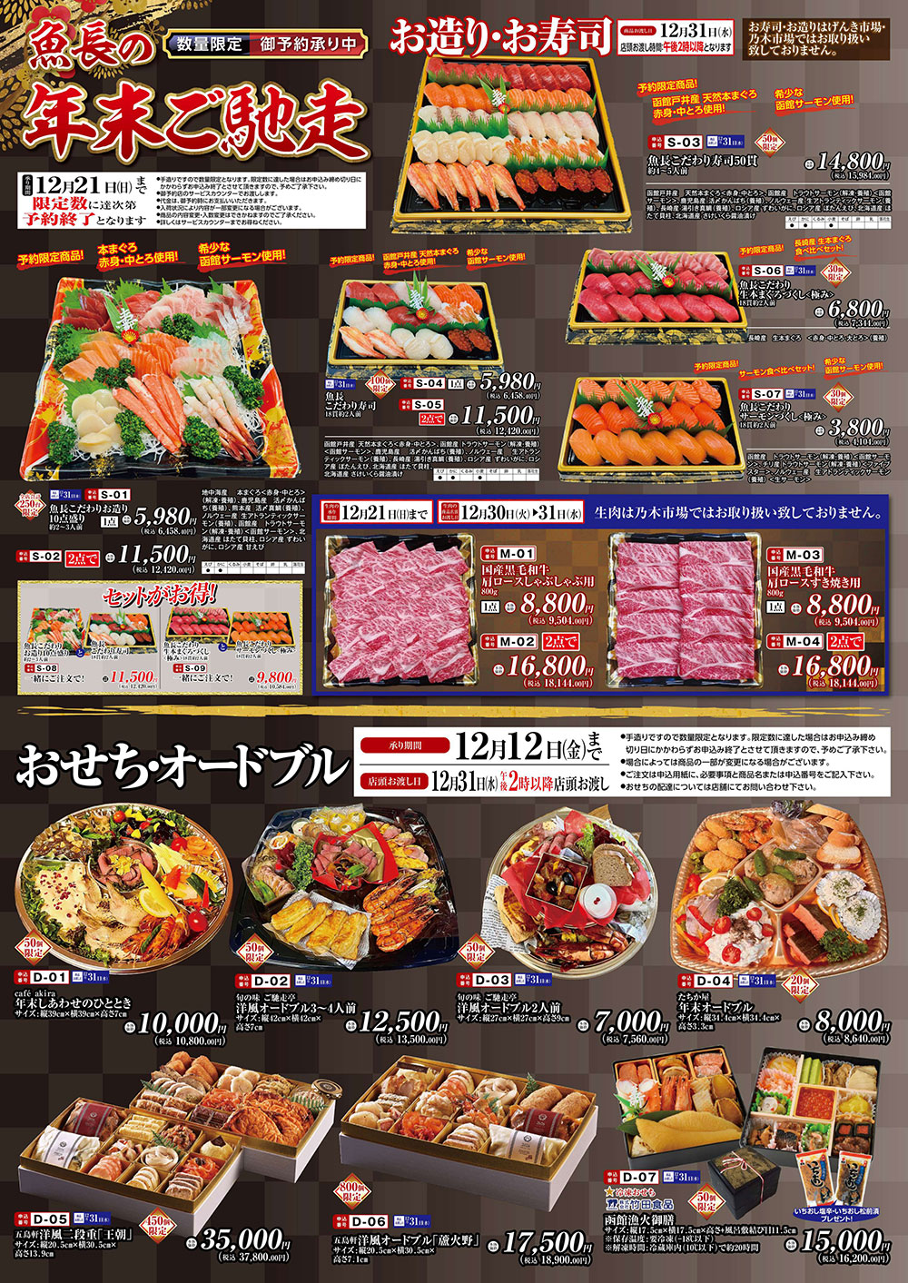 ホーム > 新着情報一覧 > 「2025年魚長の年末ご馳走(お寿司・お造り・オードブル・おせち・お肉)」ご予約承り中! 2025.11.06 NEW! 「2025年魚長の年末ご馳走(お寿司・お造り・オードブル・おせち・お肉)」ご予約承り中! お知らせ >> PDFはこちら(1.90MB) 前の記事を見る 一覧へ戻る
